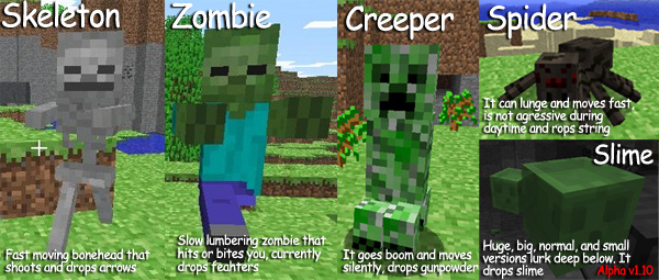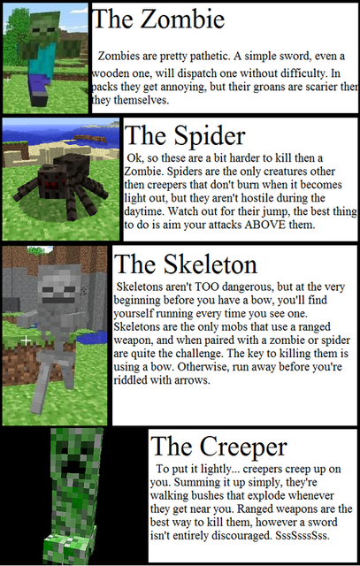 Minecraft is a fun game in a world of pixelated blocks. When you play minecraft you can build and build as much as you want. First you create a world. Your world can be creative, where you already have all items in the game and you can fly, you can do survival, where you start of with nothing, or you can do hardcore, where you have no items and if you die you have to delete the world. In all of these types of worlds you can change the mode from Normal, hard, and peaceful. In normal mode there are mobs (Zombies, Creepers, Endermen, Skeletons, slimes, and spiders) which can kill you, in hard mode it's pretty similar to normal but with more mobs and zombies can break down doors. In peaceful mode there are no mobs at all. In creative mode you can't die